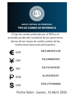 Valencia, 15 de abril de 2026-. Así cotizará el dólar BCV para el 16 de abril. El Banco Central de Venezuela (BCV) dio a conocer la actualización del monto cambiario del dólar en Venezuela para el 16 de abril.