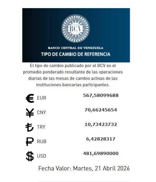BCV actualiza el tipo de cambio para este martes 21 de abril. El Banco Central de Venezuela publicó las tasas de referencia para las principales divisas internacionales. El tipo de cambio del BCV se ubicó en 481,69 bolívares por dólar para la jornada de este martes. Este valor surge del promedio ponderado de las mesas de cambio de las instituciones bancarias. Por consiguiente, el mercado oficial refleja la dinámica de las operaciones diarias en el sector financiero. La institución recomienda utilizar estos montos para cualquier transacción comercial legal.