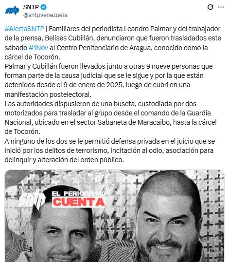 “Las autoridades dispusieron de una buseta custodiada por dos motorizados para llevarlos desde el comando de la Guardia Nacional en Sabaneta, Maracaibo, hasta Tocorón”, detalló el SNTP en su cuenta de X.