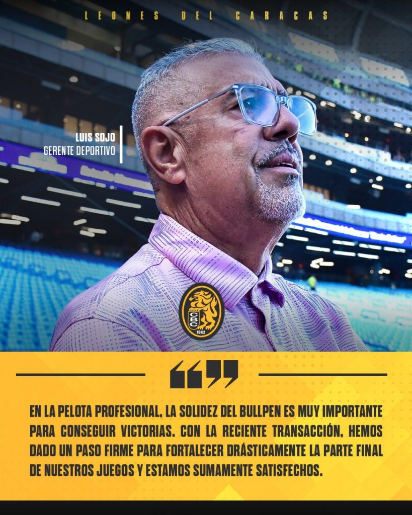 Valencia, 4 de noviembre de 2025-. Declaraciones de Luis Sojo sobre el pitcheo de los Leones del Caracas desató polémica entre la fanaticada. El conjunto melenudo anunció oficialmente la incorporación de Anthony Vizcaya a su nómina, buscando fortalecer un bullpen que ha mostrado dificultades esta temporada.