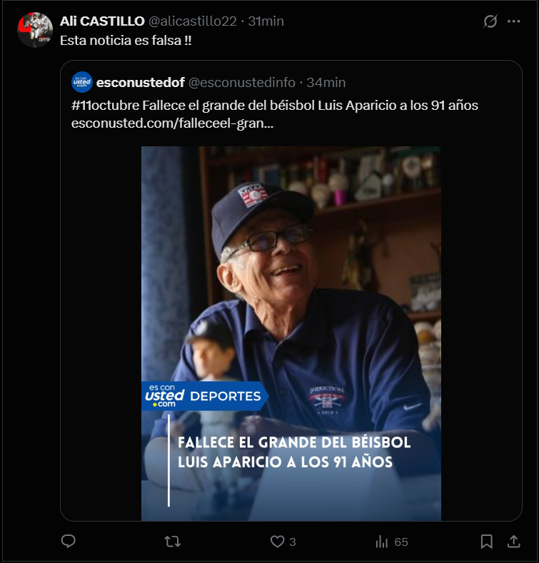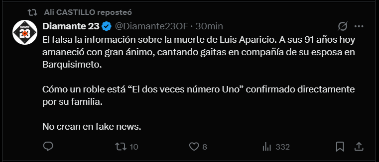 «El falsa la información sobre la muerte de Luis Aparicio. A sus 91 años hoy amaneció con gran ánimo, cantando gaitas en compañía de su esposa en Barquisimeto. Cómo un roble está “El dos veces número Uno” confirmado directamente por su familia. No crean en fake news», escribió la cuenta de Diamante 23.