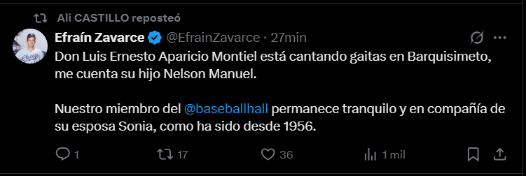 Por otro lado, el periodista deportivo Efraín Zavarce, publicó en X que: «Don Luis Ernesto Aparicio Montiel está cantando gaitas en Barquisimeto, me cuenta su hijo Nelson Manuel. Nuestro miembro del @baseballhall permanece tranquilo y en compañía de su esposa Sonia, como ha sido desde 1956″.