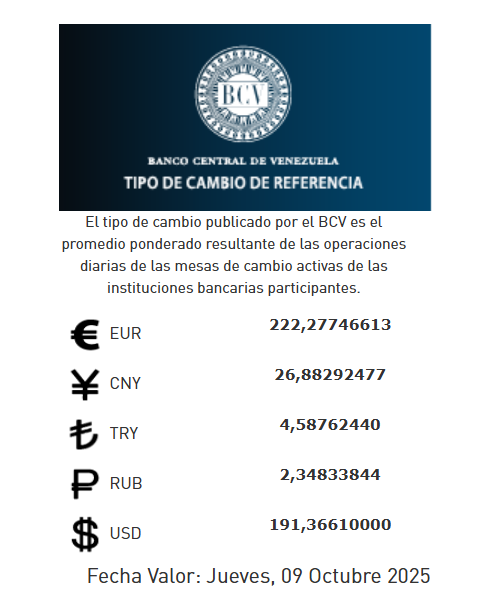 Dólar oficial superó los 190 bolívares (detalles). El Banco Central de Venezuela (BCV) publicó este jueves 9 de octubre de 2025 su tipo de cambio de referencia, arrojando un valor de 191,3661 bolívares por dólar (USD). Este promedio ponderado refleja las operaciones diarias realizadas en las mesas de cambio activas de las instituciones bancarias participantes.