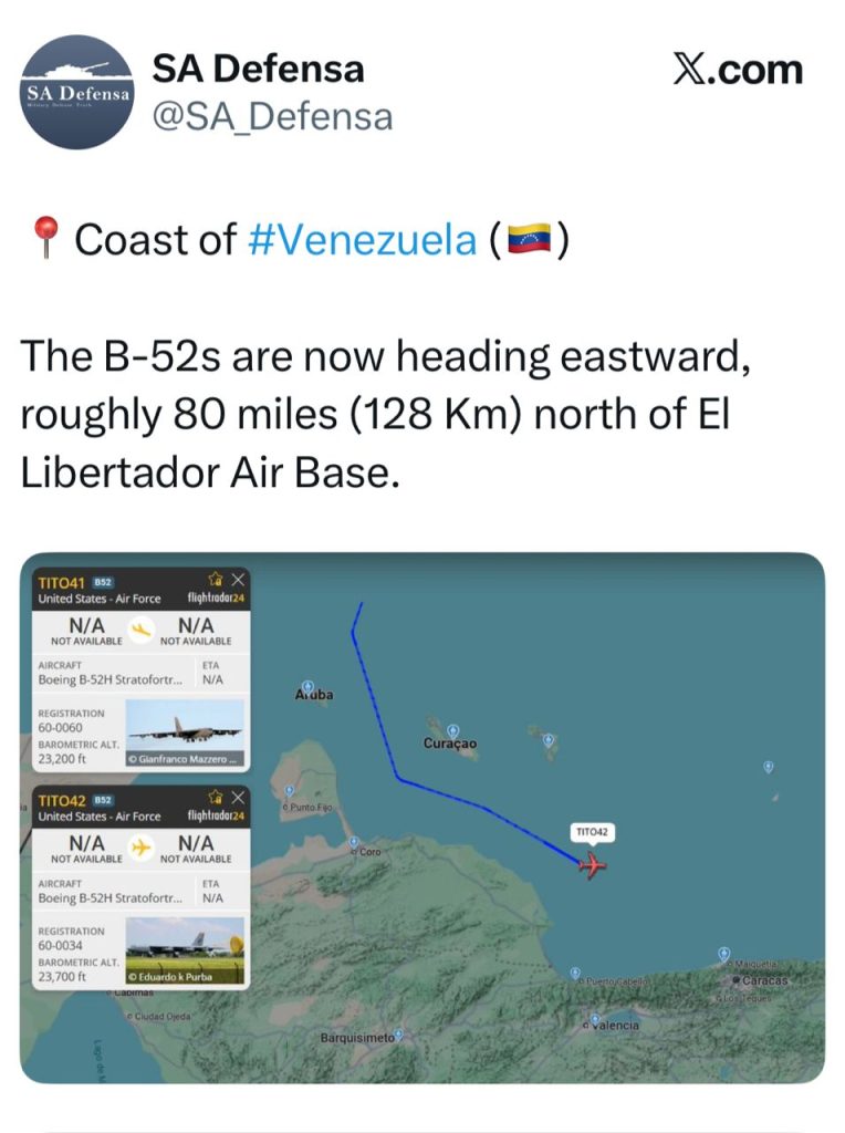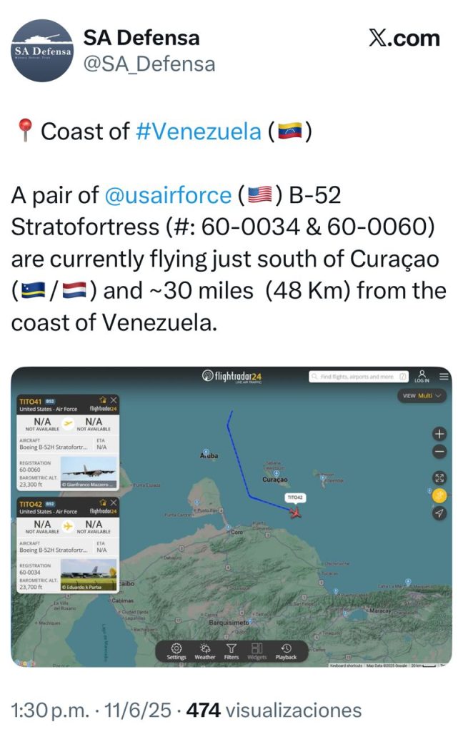 El organismo publicó en la red social X una captura del sitio FlightRadar24 donde se aprecia la trayectoria de las aeronaves. “Dos bombarderos B-52 Stratofortress están volando actualmente al sur de Curazao y a unos 30 millas de Venezuela”, indicó el mensaje oficial.