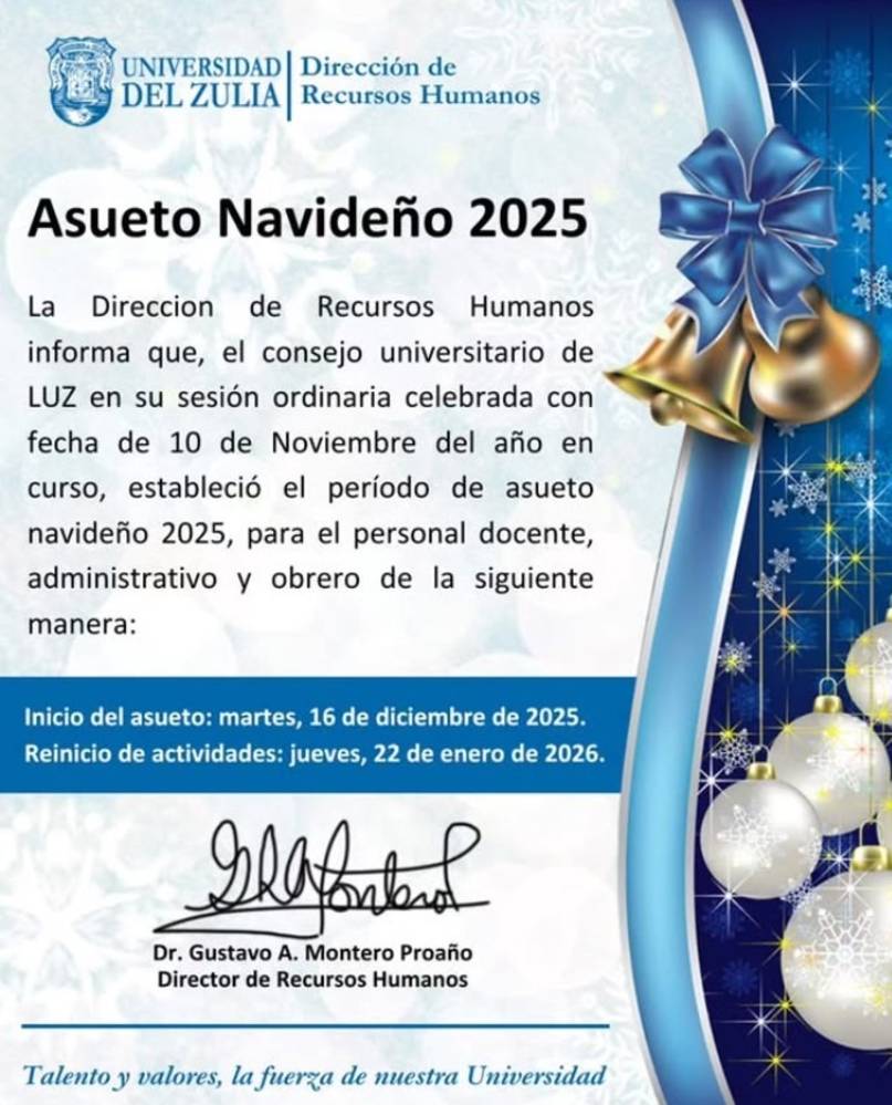 Valencia, 14 de noviembre de 2025-. Estas son las fechas del asueto navideño 2025-2026 para el sector universitario. La Dirección de Recursos Humanos informó que el Consejo Universitario aprobó el cronograma oficial durante la sesión del 10 de noviembre.