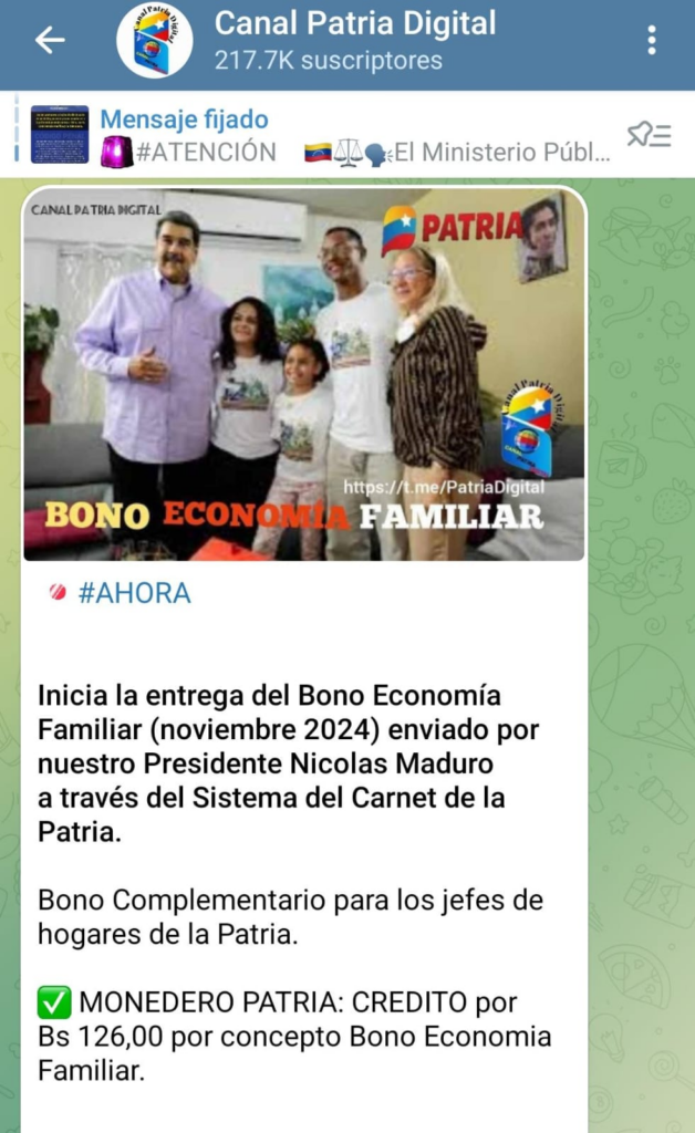 A través de la Plataforma Patria, los beneficiarios han recibido un crédito de 126 bolívares en sus monederos digitales, etiquetado bajo el concepto «Bono Economía Familiar».