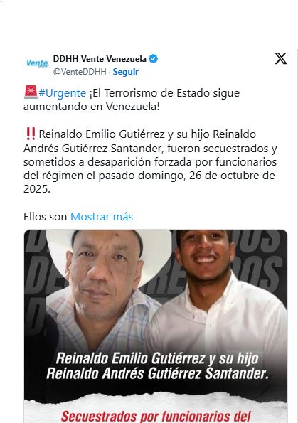 Valencia, 29 de octubre de 2025-. Vente Venezuela denunció la desaparición de dos trabajadores vinculados a la familia de María Corina Machado. Vente Venezuela informó que Reinaldo Emilio Gutiérrez y su hijo Reinaldo Andrés Gutiérrez Santander fueron detenidos presuntamente por funcionarios del gobierno.
